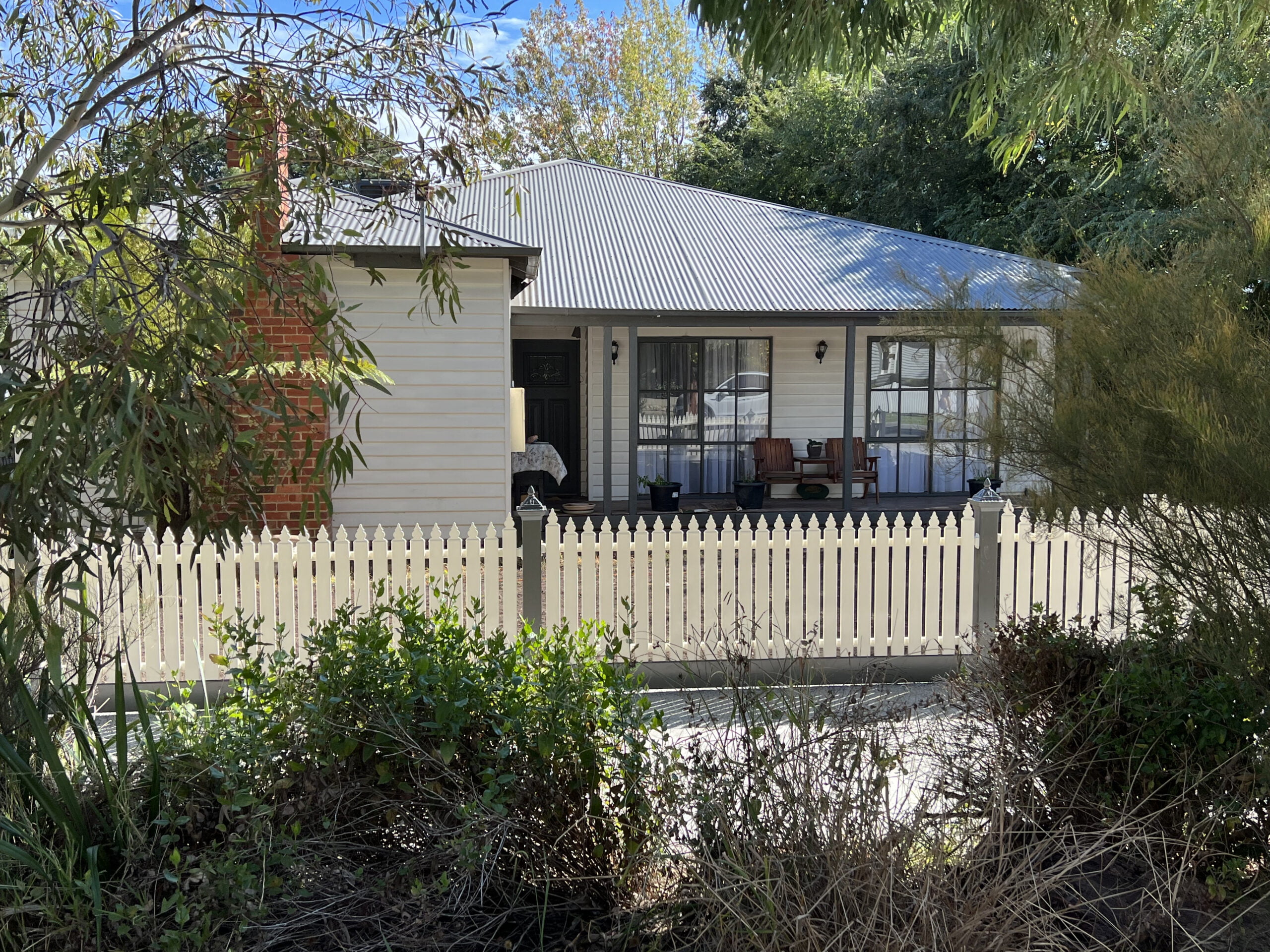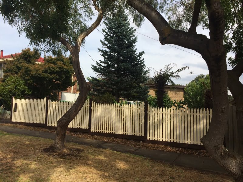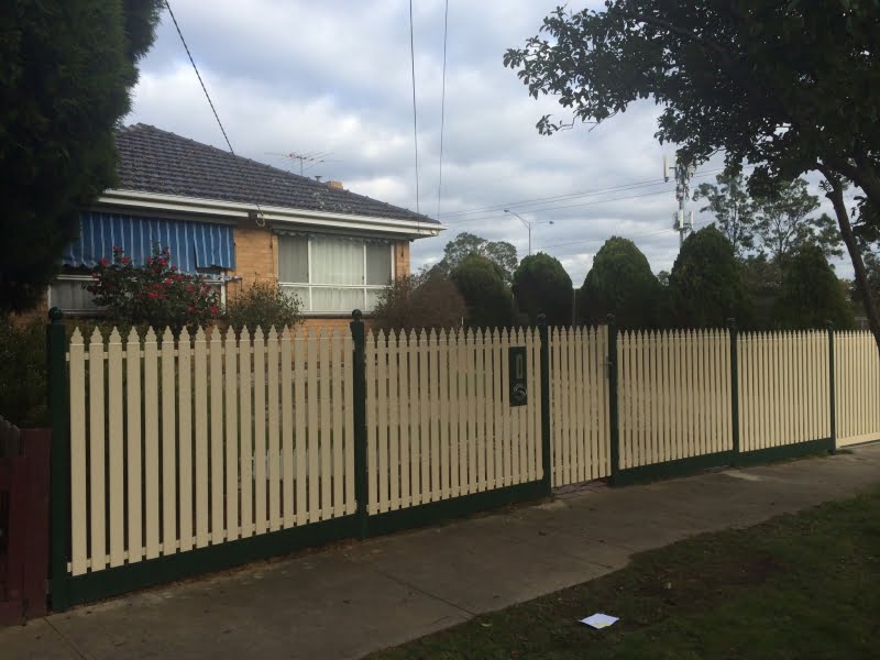 Cream steel picket fence with brown letterbox, posts and bottom rail - Geelong